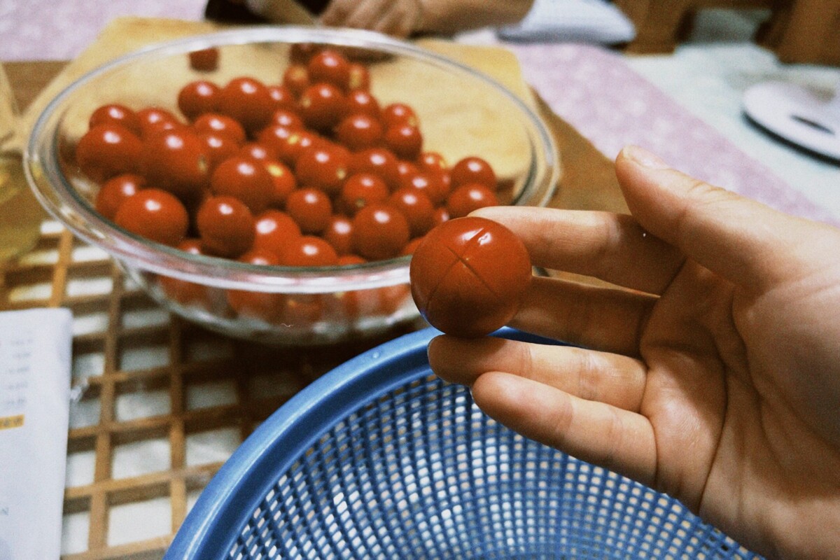 처음엔 그냥 생으로 먹을까 했지만, 왠지 올해 첫 수확한 방울토마토는 마리네이드를 만들어보고 싶었습니다. 새콤하고 산뜻한 기름기, 껍질을 벗긴 토마토의 부드러움, 냉장고에서 하루쯤 숙성된 뒤 퍼지는 올리브오일의 깊은 향. 모든 여름의 조각들을 한 병에 담고싶었어요.