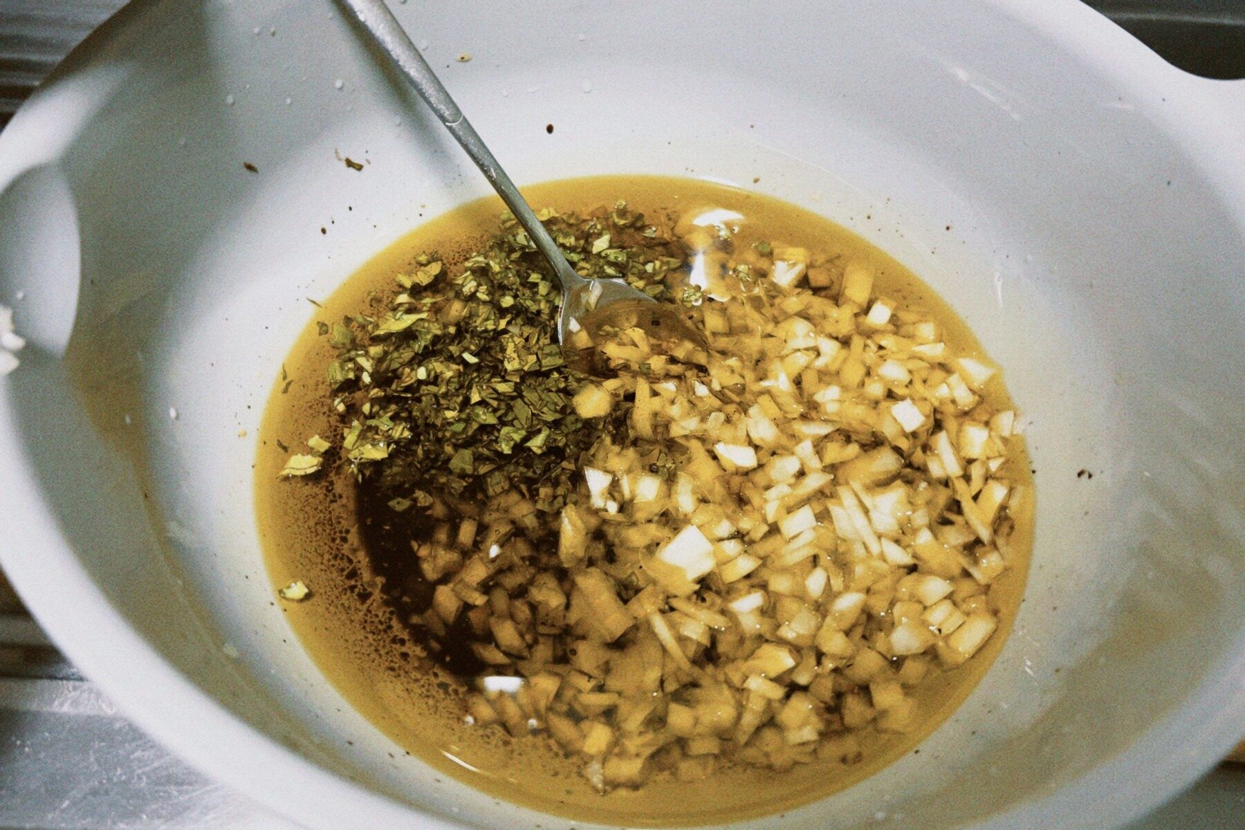 끓는 물에 살짝 데쳐 껍질을 벗기자, 토마토 껍질이 살짝 벌어지고 신선한 향이 주방 가득 퍼집니다. 소금, 후추, 올리브오일, 꿀, 발사믹식초, 다진마늘 많이많이.